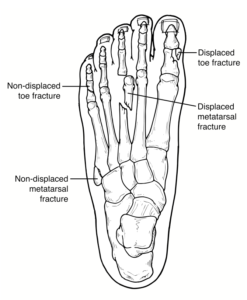 The structure of your foot is complex, consisting of bones, muscles, tendons, and other soft tissues. Of the 26 bones in your foot, 19 are toe bones (phalanges) and metatarsal bones (the long bones in the midfoot). Fractures of the toe and metatarsal bones are common and require evaluation by a specialist. A podiatric foot and ankle surgeon should be seen for proper diagnosis and treatment, even if initial treatment has been received in an emergency room.